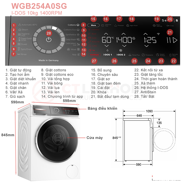 Máy giặt của trước Bosch WGB254A0SG dòng series 8 mới nhất của hãng Bosch thương hiệu Châu Âu máy được sản xuất nhập khẩu nguyên chiếc từ CHLB Đức.