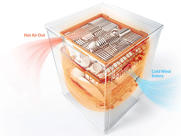 - Bảo quản giữ khô & ấm trong 168h (7 ngày) Với cơ chế hoạt động theo chu kỳ bật – tắt, luân phiên lấy khí từ bên ngoài, thổi nhẹ vào khoang máy và đẩy hơi ẩm ra ngoài. Giúp ngăn mùi và hơi nước từ ống thải quay ngược, giữ bát đĩa luôn sạch sẽ, khô ráo mà vẫn tiết kiệm điện năng